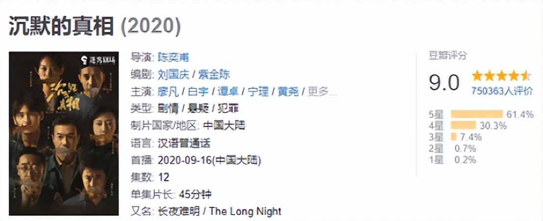 《沉默的真相》在2020年播出,讲述执着真相的检察官江阳,不惜任何代价,只为查清陈年旧案真相的故事,至今豆瓣评分为9.0