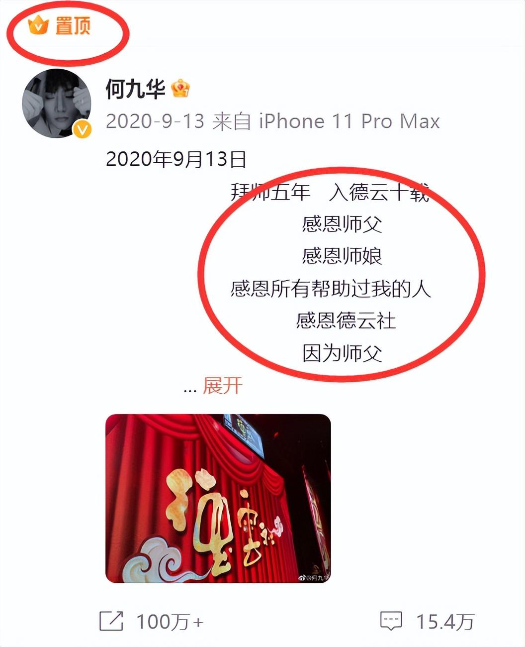 何九华的置顶微博,也是在感谢郭德纲夫妻和德云社。到2023年,何九华已经拜师郭德纲8年,入了德云社13年。对于一个36岁的中年人而言,这无疑是人生很重要的组成部分。