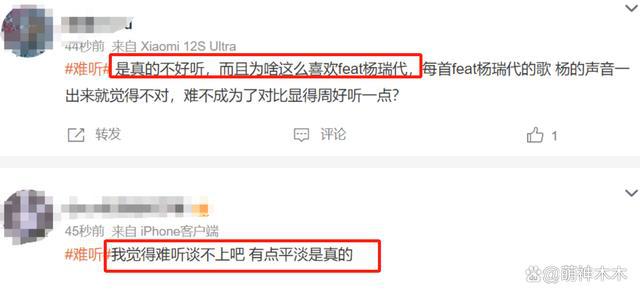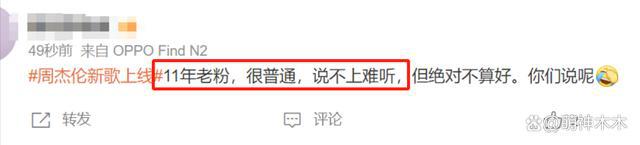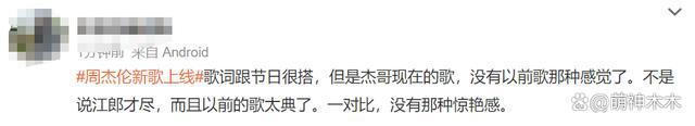 其次,周杰伦新歌也遭遇了吐槽。" 难听 " 广场彻底沦陷,认为周杰伦的新歌旋律平淡,周杰伦的咬字一如既往地让人听错含义。还有粉丝表示虽然说不上难听,但确实没有惊艳感了,非常普通。