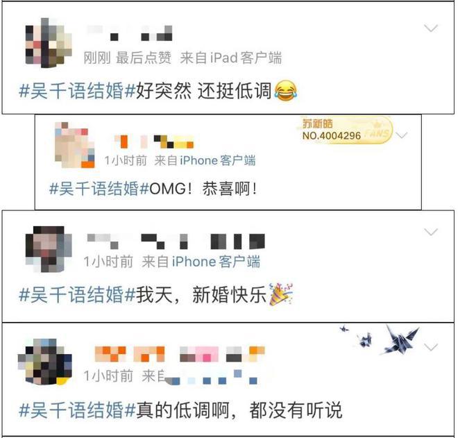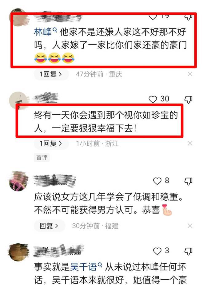 由于吴千语虽身处娱乐圈,但出道这么多年,她的口碑和形象一直保持得不错,继而网友们获悉此等喜事,也纷纷在评论区留言送祝福。