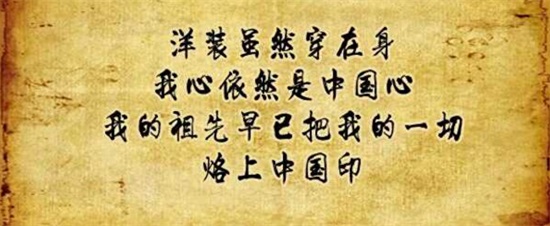 “洋装虽然穿在身,我心依然是中国心,我的祖先早已把我的一切,烙上中国印……”
