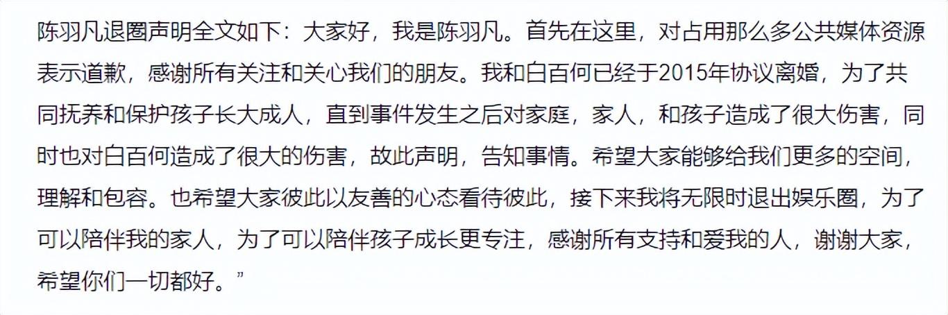 直到几天后的凌晨,陈羽凡发布了一条微博,声明自己与白百何早在两年前就已经协议离婚了,只是没有对外公开此消息。还说自己将无限时退出娱乐圈。