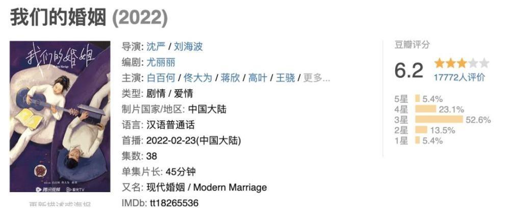 然而收视率却又狠狠地打击了白百何,《我们的婚姻》收视率被同类题材的《心居》实力碾压,豆瓣评分也只拿到了6.2的及格分。