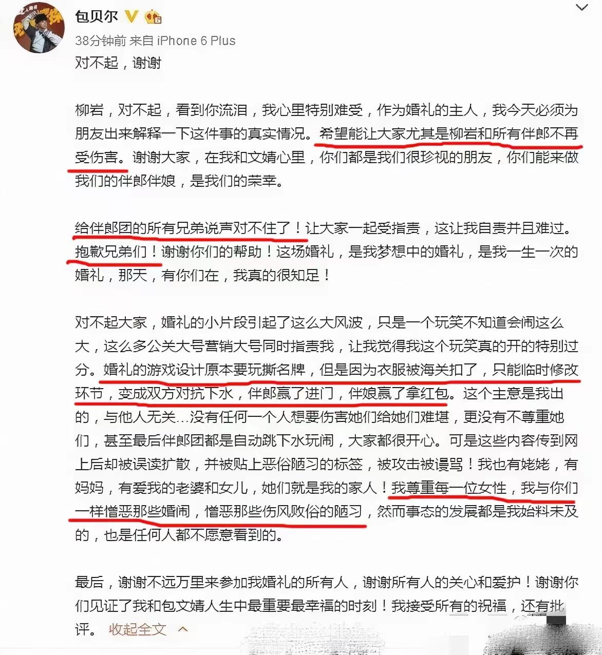 婚礼主人包贝尔写了一篇“情深意切”的道歉小作文。