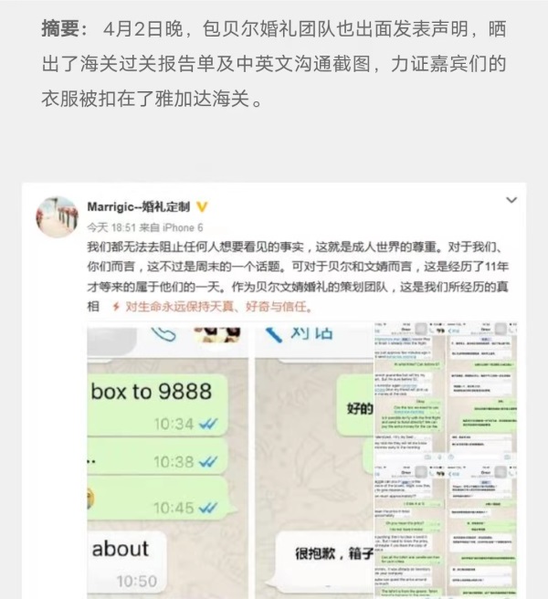 团队发声明表示,婚礼前准备了定制衣服,但被扣在雅加达海关,导致柳岩穿薄纱险些遇水走光。