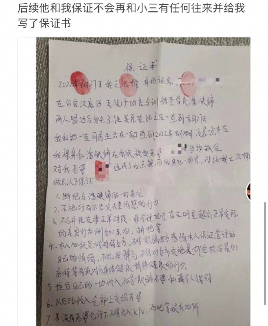 不仅拍到了小三承认同居事实的视频,还拿到了王浩楠亲手写的保证书,承诺不会再和小三有任何往来。