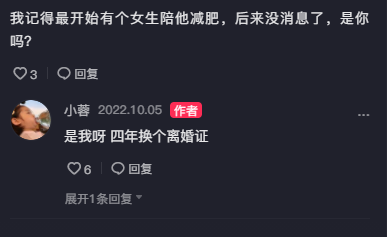 而小蓉也回复称,结婚没多久男方就和别人同居了,自己用4年时间陪他减肥,最后只换了个离婚证。