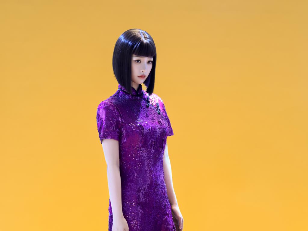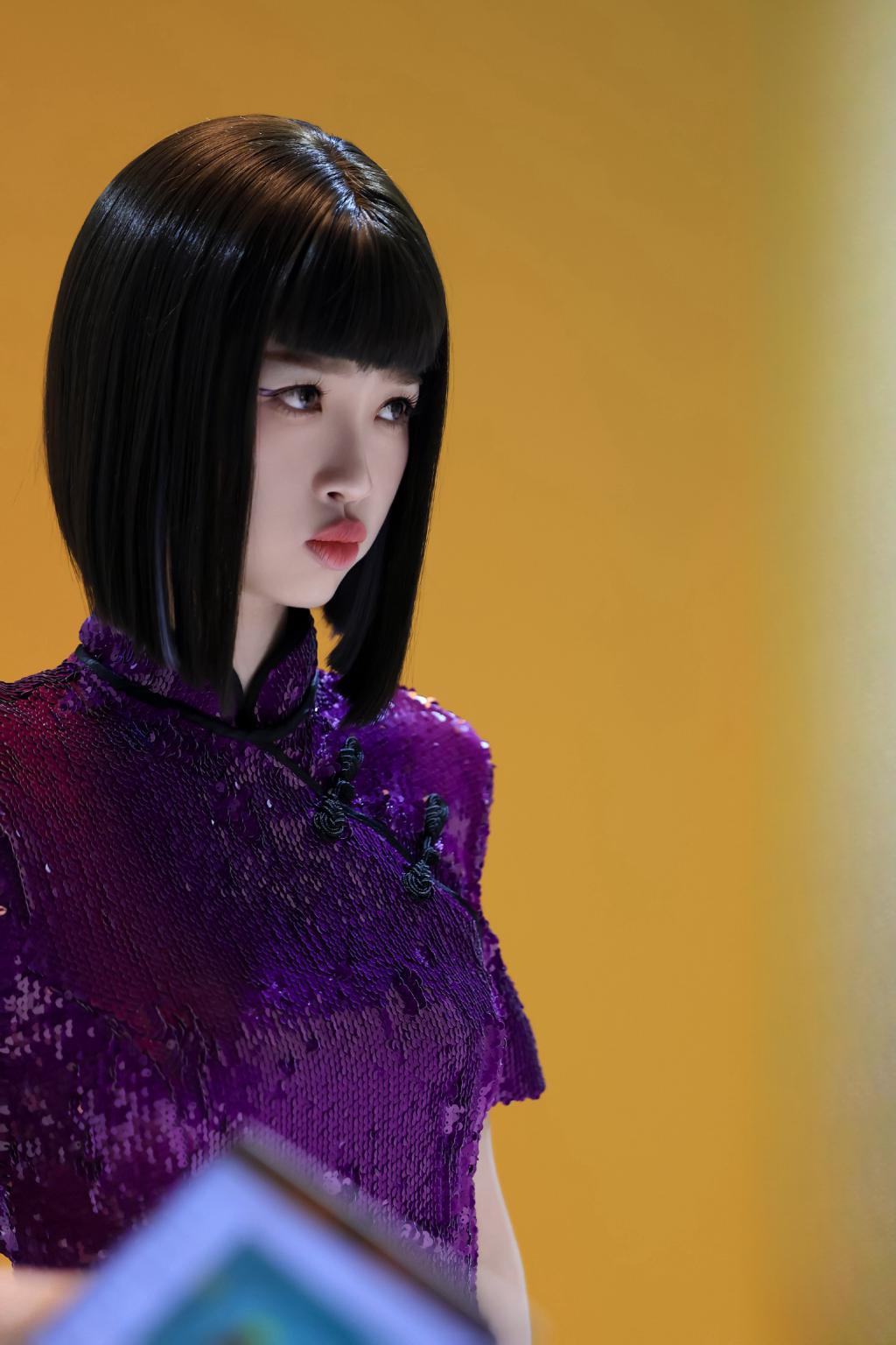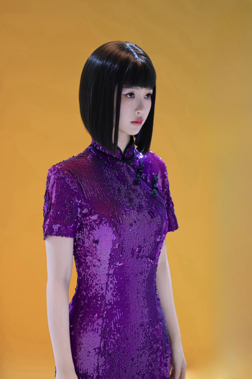 虞书欣穿紫色旗袍换短发 表情冷淡似机器人