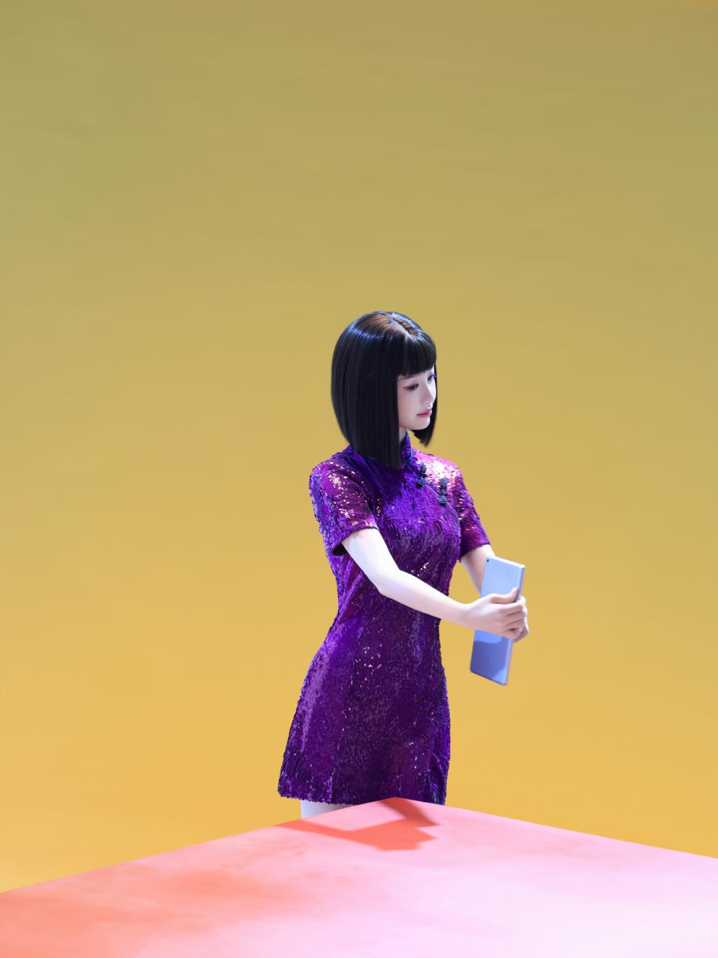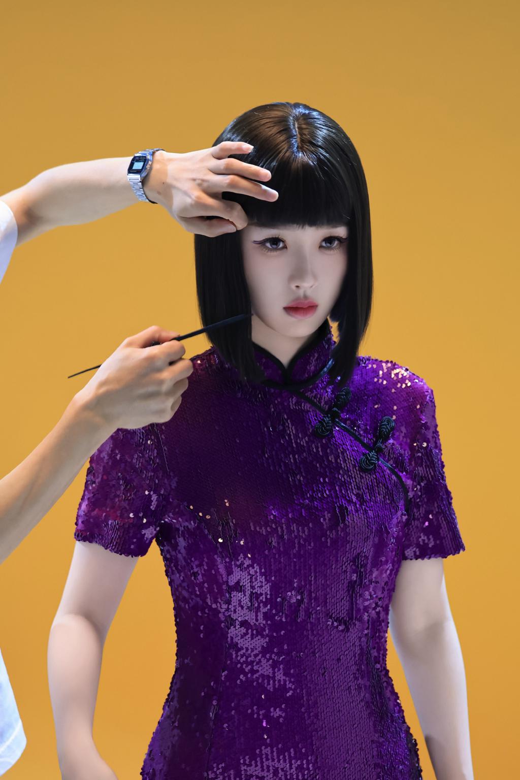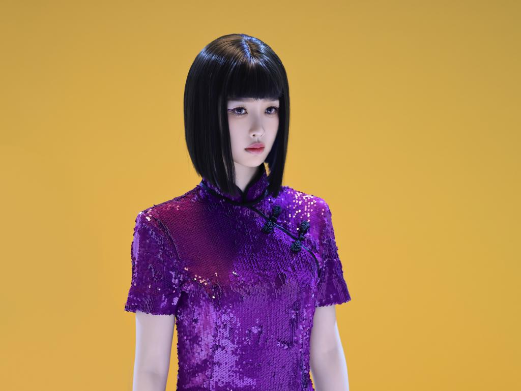 虞书欣穿紫色旗袍换短发 表情冷淡似机器人