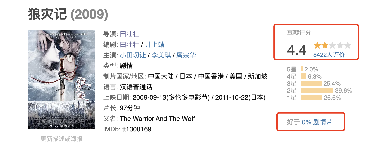 现实总是很残酷的,好就是好,不好就是不好,观众的评分某种意义上已经宣判了《狼灾记》的失败。截止今日,《狼灾记》的评分只有4.4分,在剧情片中排名最低,确实很难堪。