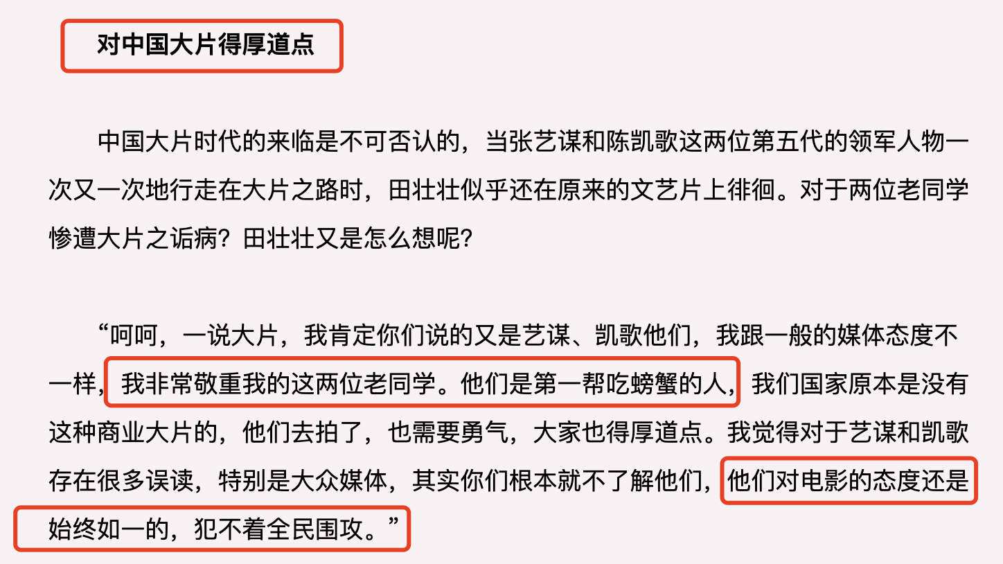 “我非常敬重我的这两位老同学。他们是第一个敢吃螃蟹的人,我们原本是没有这种商业大片的,他们去拍了,也需要勇气,大家也得厚道点。我觉得很多人误解凯歌、艺谋了。”