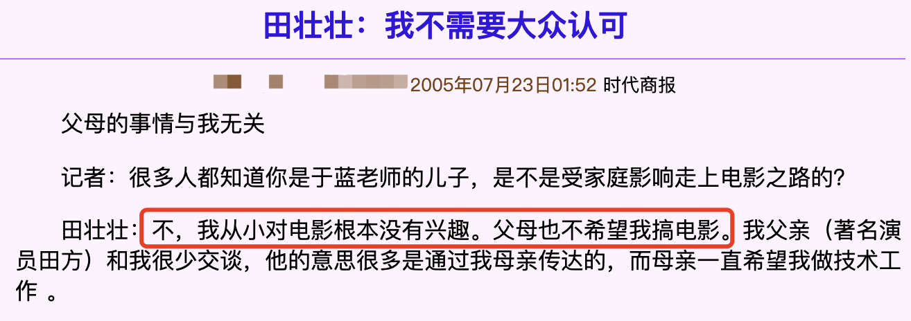 有一次采访,记者问田壮壮:“很多人都知道你是于蓝老师的儿子,是不是受家庭影响走上电影之路的?”