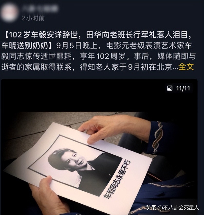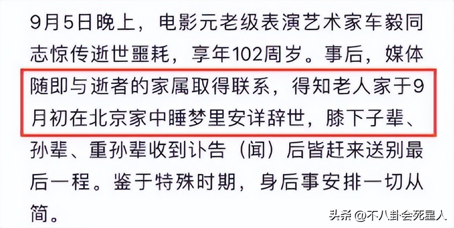 之前曾有媒体透露,车毅于9月初去世,享年102岁,当时老人还在睡梦中,是十分安详地辞世。而鉴于疫情特殊时期,车毅的身后事一切安排从简,膝下儿孙辈、重孙辈都纷纷赶来送别最后一程。