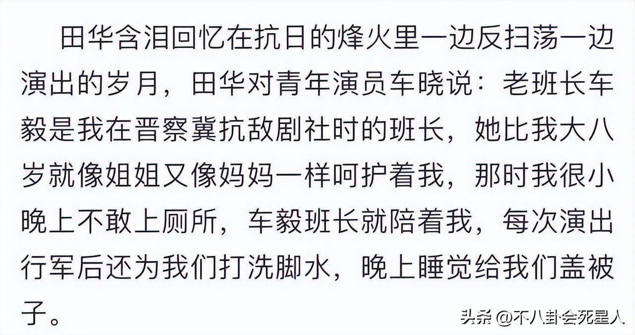 据田华本人透露,车毅是她在晋察冀抗敌剧社时的班长,两人关系十分亲密,由于车毅年长8岁,所以一直对田华很照顾。
