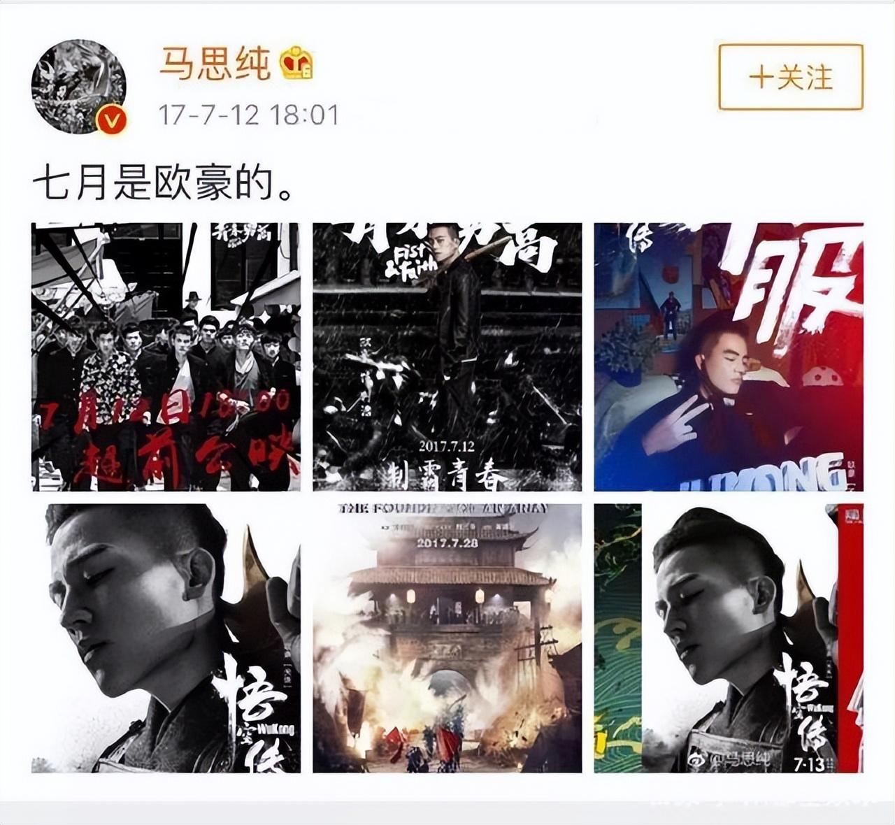 2017年7月,马思纯在社交平台发文:七月是欧豪的。