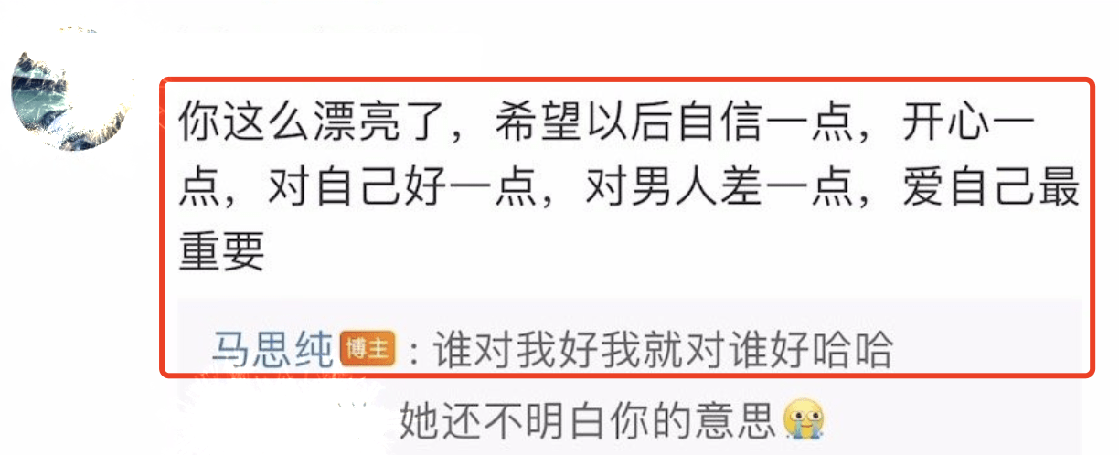 最五味杂陈的莫过于钟爱马思纯的部分网友,劝她远离渣男的声音从未间断过,到后来慢慢变得无奈:别对男人太好,对自己好点。